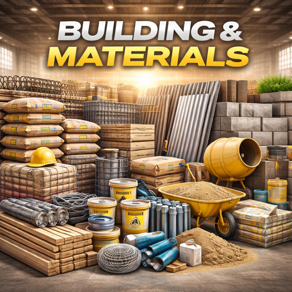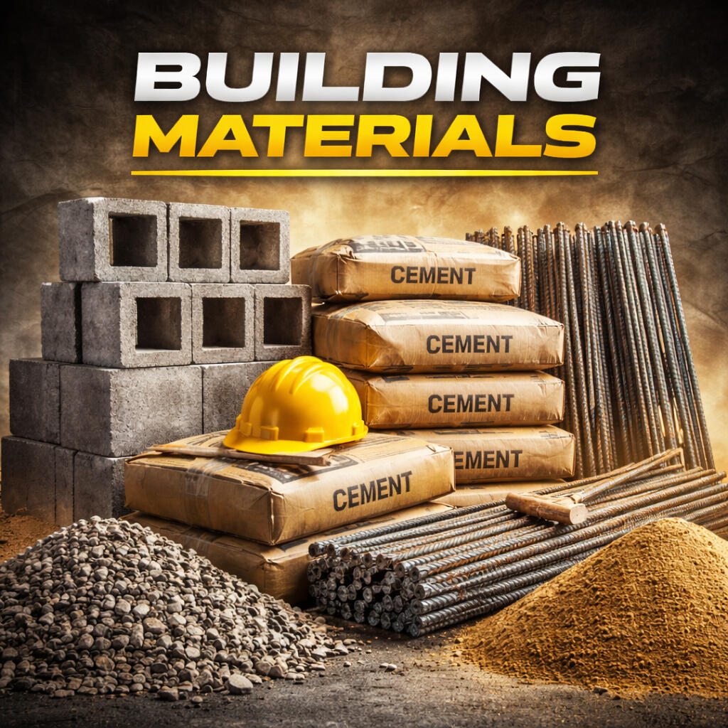 Blocks. Cement. Steel. Sand. Gravel. Beams.This is the foundation. From small backyard projects to full-scale construction, this section covers all structural and heavy-load materials. Visual: stacks of blocks, rebars, cement bags, sand piles.