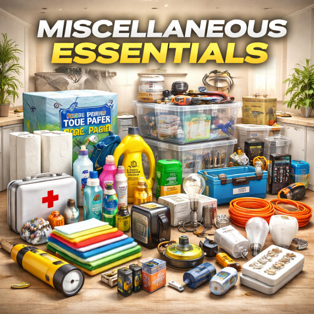 Paint. Tapes. Gloves. Storage bins. Small gear.Everything else that gets forgotten but always needed. Safety gloves, lightbulbs, tapes, toolboxes, etc. Visual: shelf corner or bin overflow of colorful, mixed useful items.