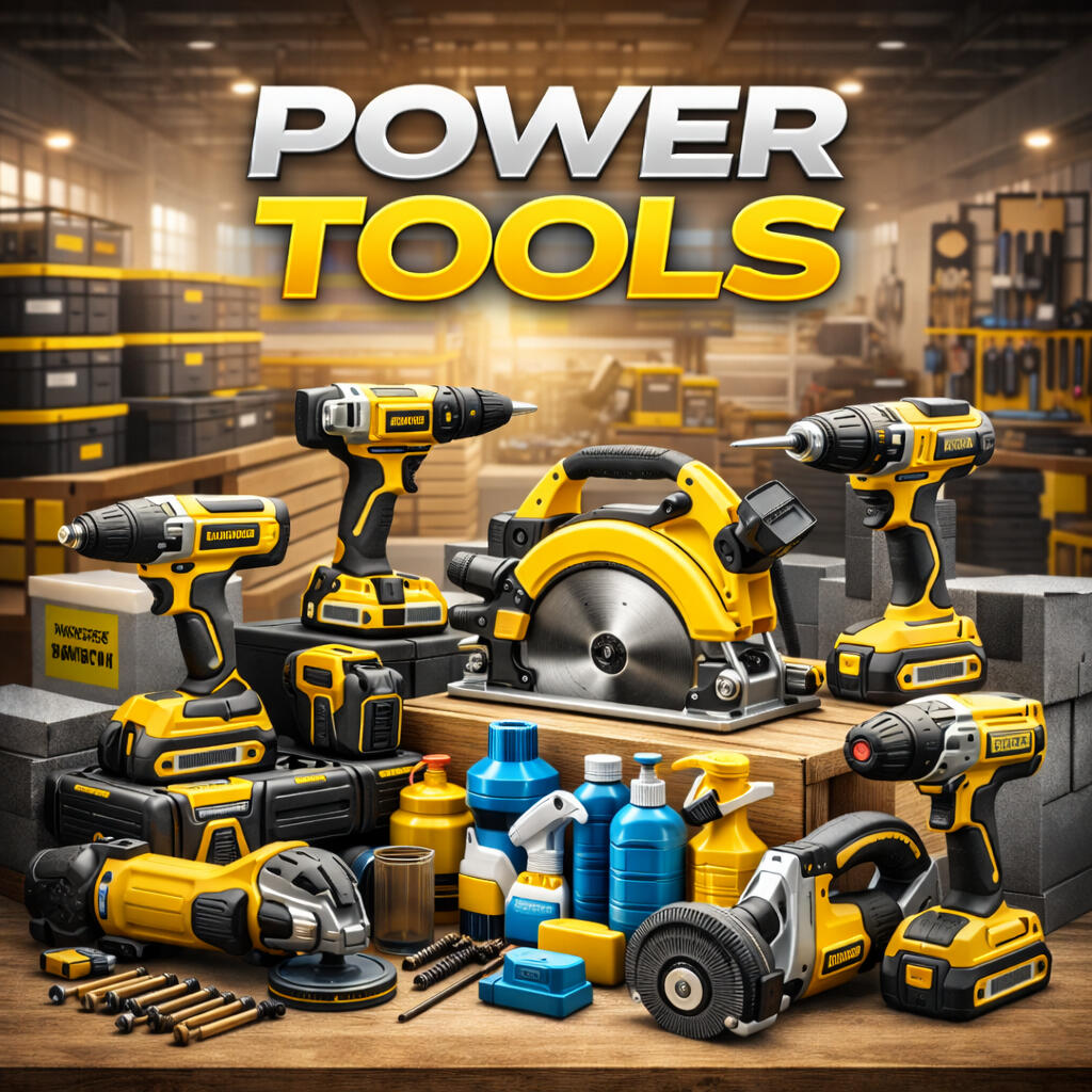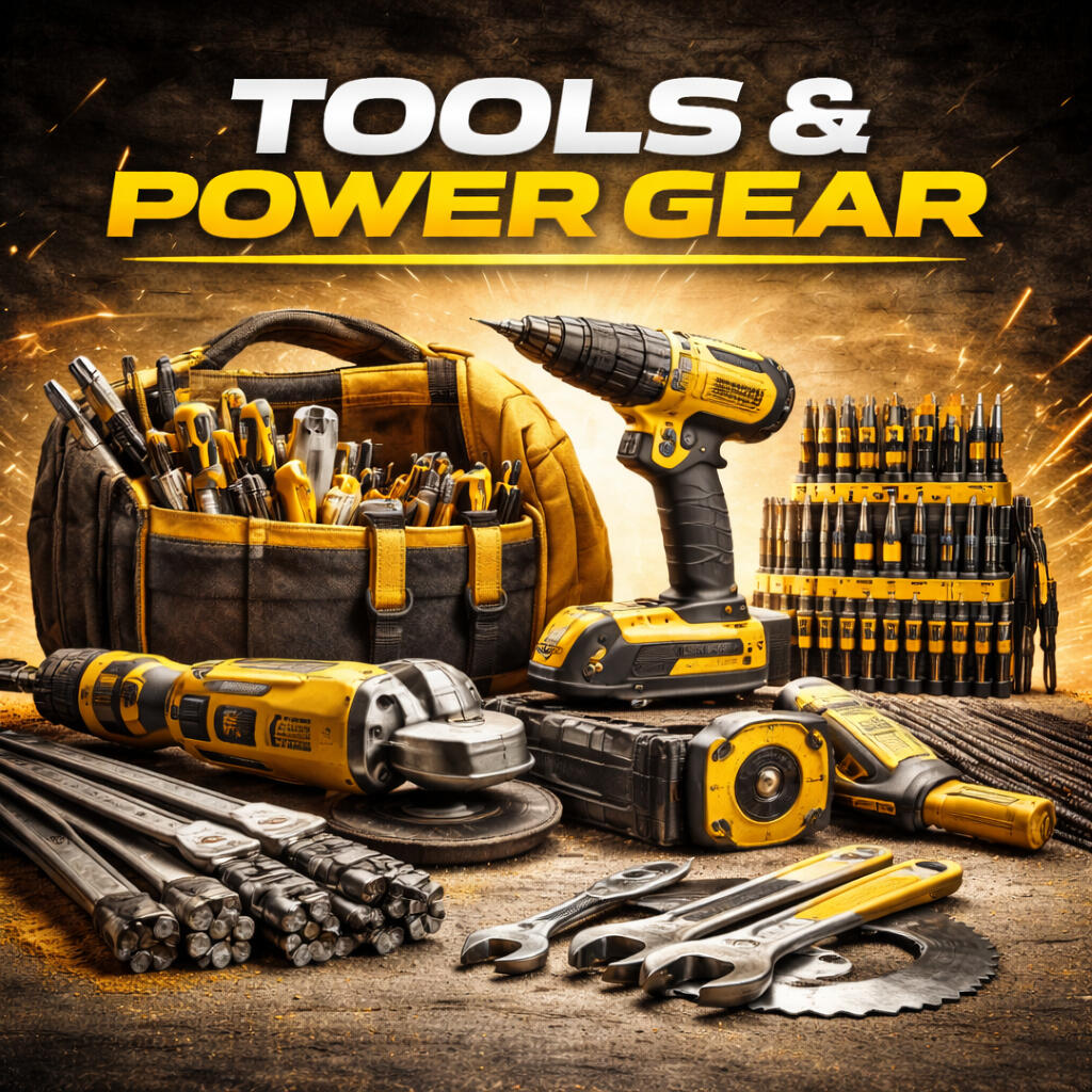 Drills. Grinders. Hand tools. Blades. Bits.All the muscle you need. For professionals and serious DIY, this is where electric meets precision. Highlight cordless tools, angle grinders, and bit sets. Visual: Drill in foreground, tool wall or belt in background.