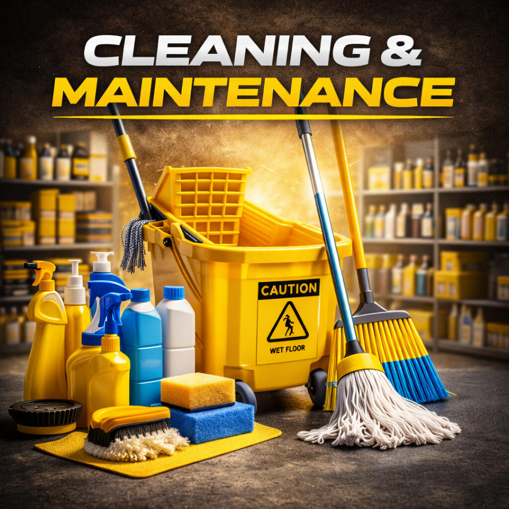 Mops. Buckets. Brooms. Scrubbers.The refresh zone. For homes, businesses, or job sites, these products keep everything clean and ready. Visual: Mop + bucket set, maybe placed near an industrial shelf or janitor's cart.